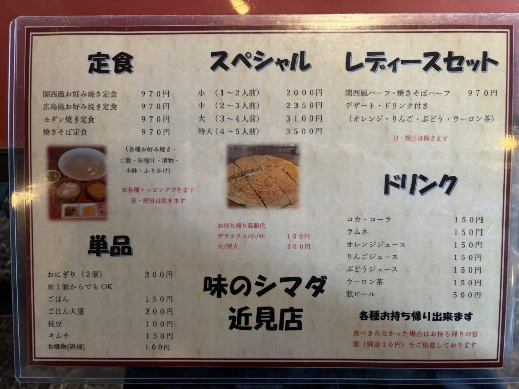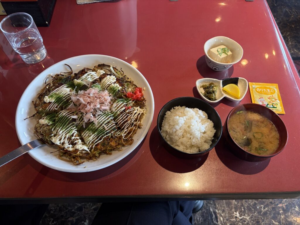 • お好み焼き定食 → ご飯・味噌汁・漬物など付きのセットで、ランチに良し。