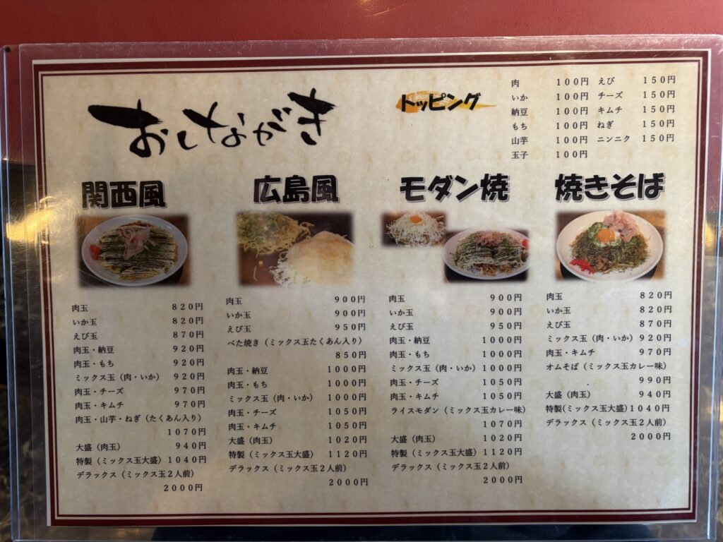 「モダン焼き(肉玉チーズなど)」「お好み焼き定食」など、満足感のあるメニューが多めです。