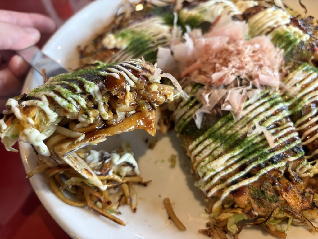 お好み焼きのふっくらとした生地と焼きそばのモチモチとした麺の両方が一度に楽しめます